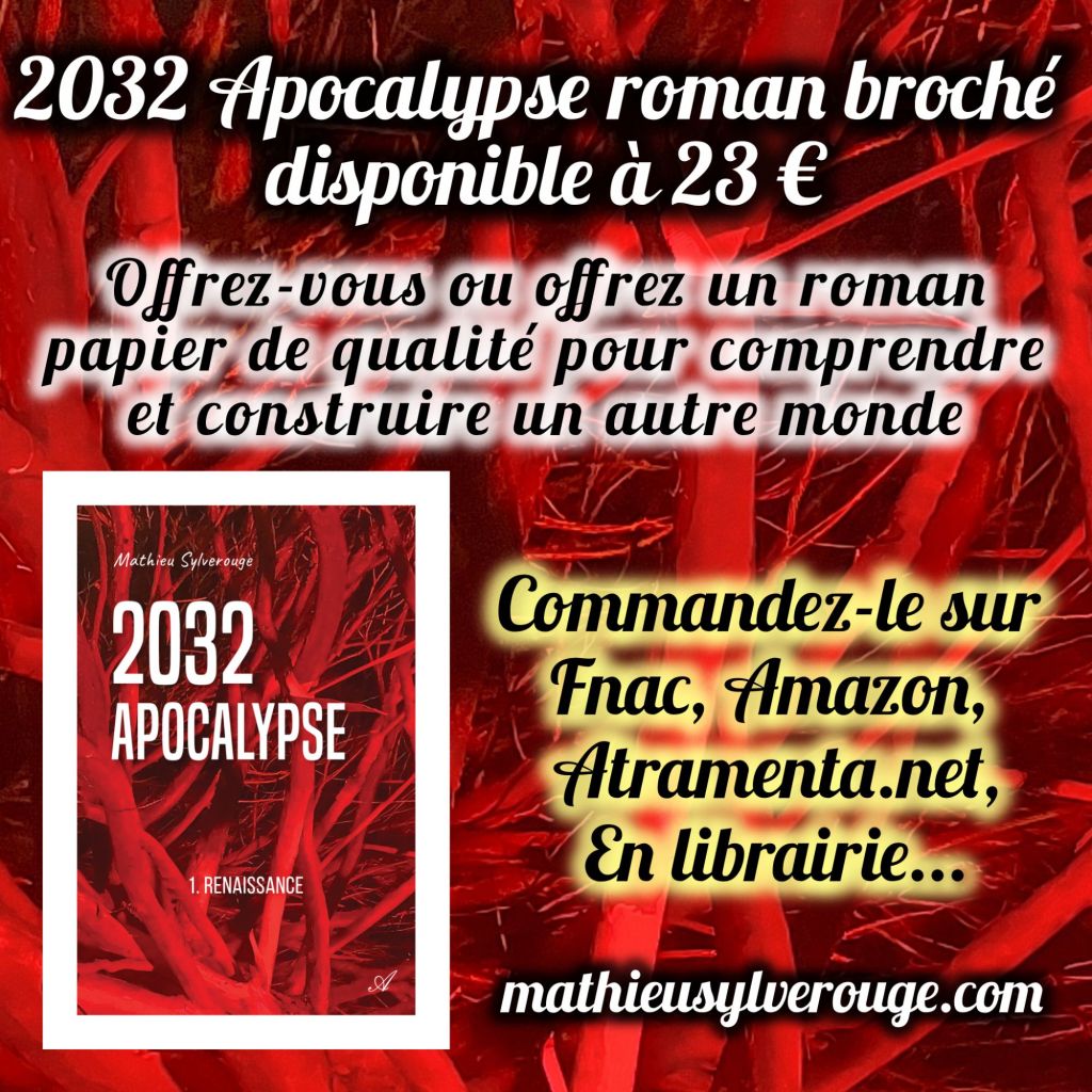 La version papier et ebook de 2032 Apocalypse tome 1 Renaissance est disponible sur atramenta.net, sur les différentes plate-formes de vente en ligne (Fnac…) et chez votre libraire préféré (en commande ou version papier chez certains libraires).